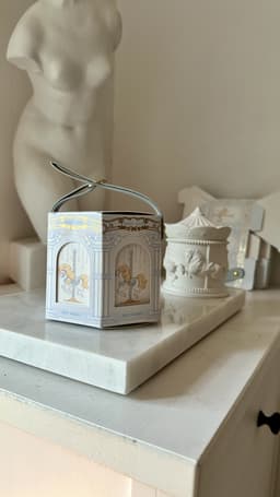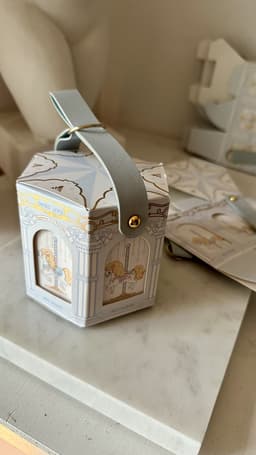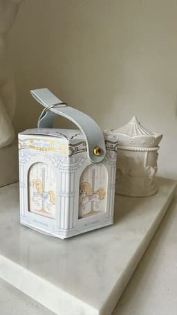 Изящная коробка-шкатулка - идеальное завершение вашего подарка. Оформлена в нежных пастельных тонах с романтическими мотивами карусельных лошадок и золотистым тиснением.